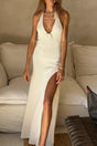 Halter Neck Crochet Flower Slit Knit Dress - White / S is backordered and will ship as soon as it is back in stock.