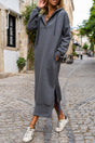 V Neck Pocketed Zipper Slit Hoodie Dress - Grey / S is backordered and will ship as soon as it is back in stock.