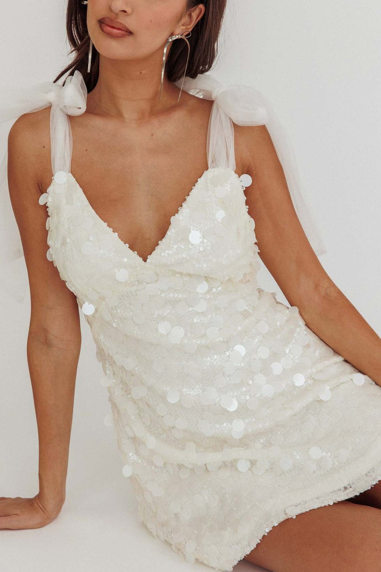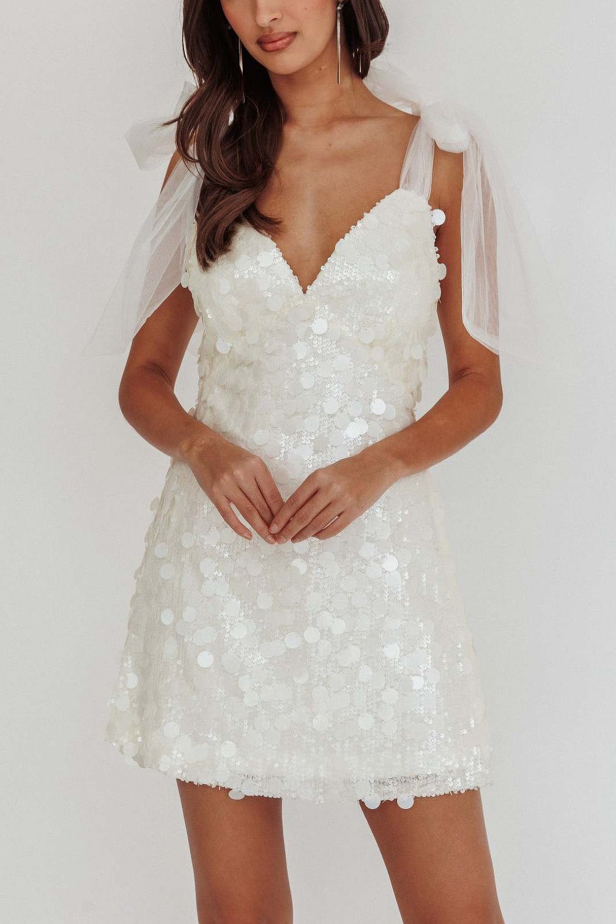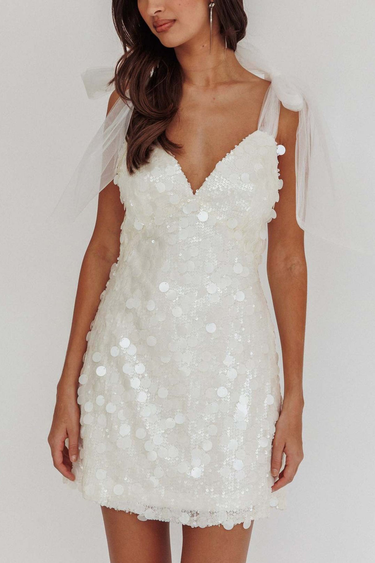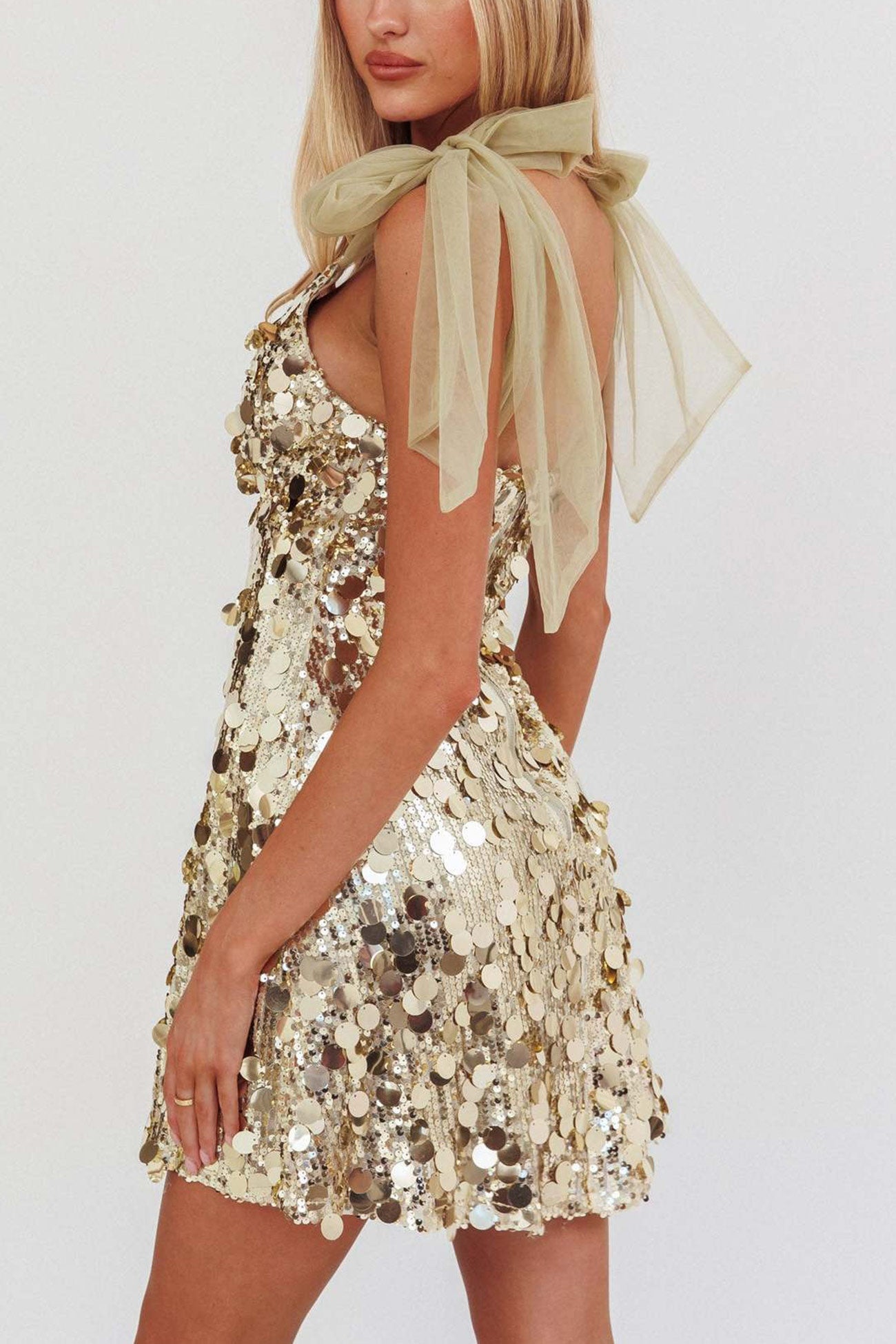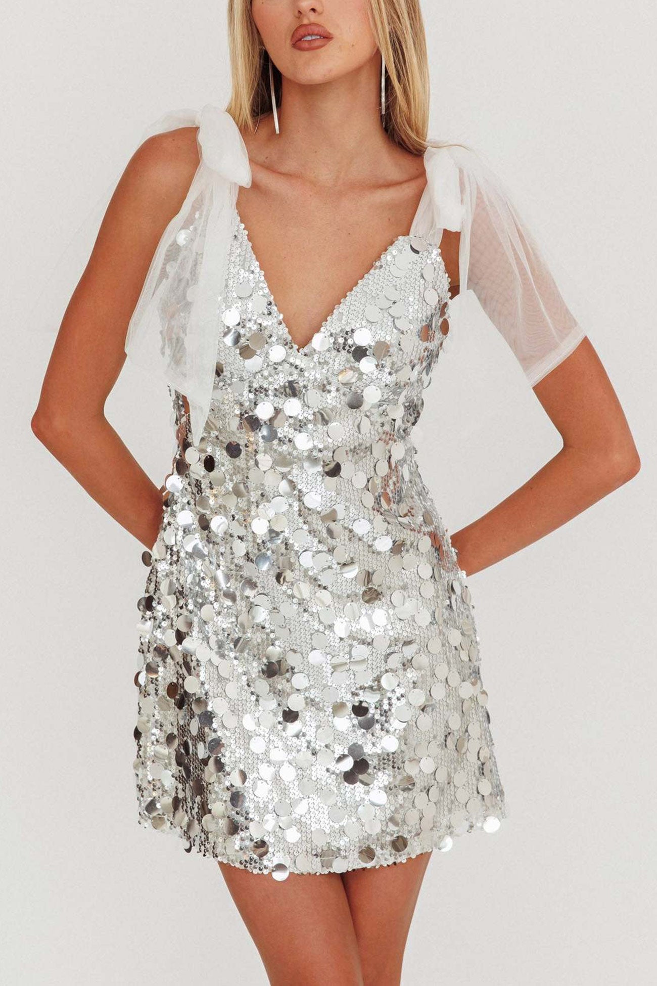 Tie-up Low Cut Sequin Mini Dress - Silver / S is backordered and will ship as soon as it is back in stock.