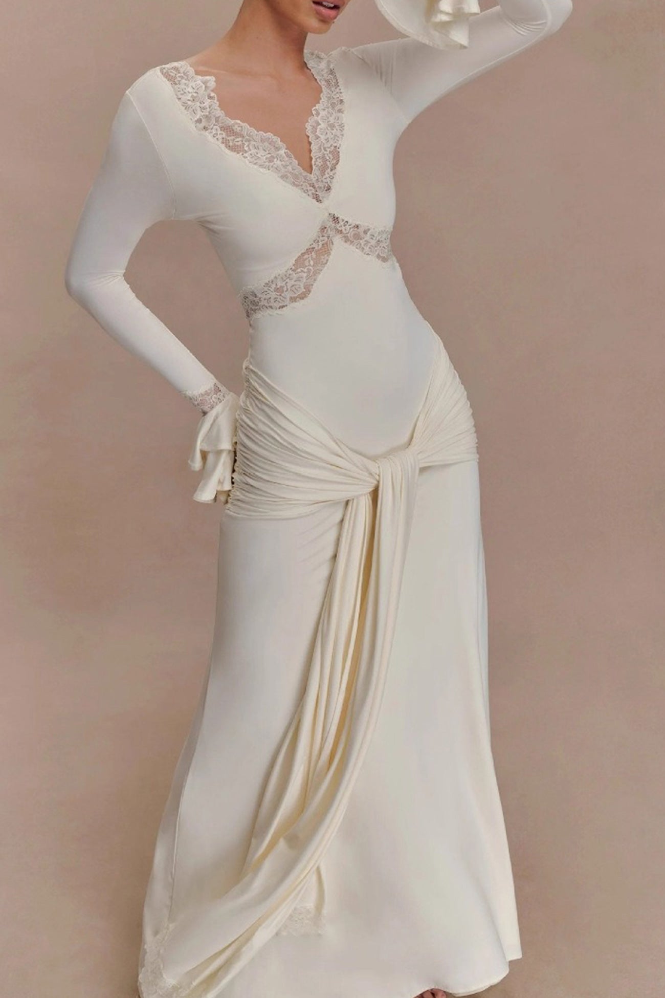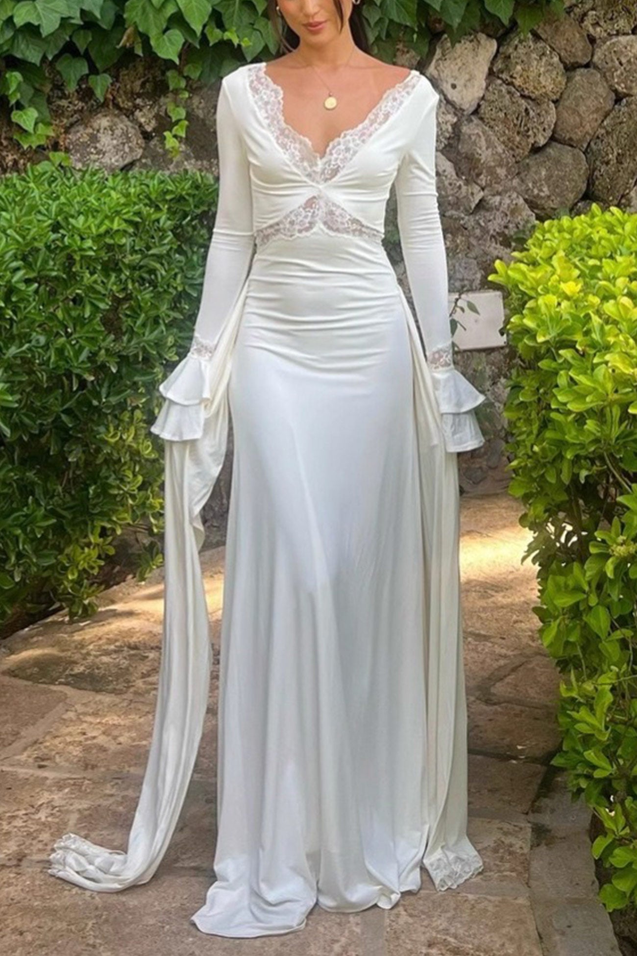 Lace Patchwork Flare Sleeve Tie-up Maxi Dress