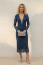 V Neck Long Sleeve Lace Bodycon Midi Dress - Blue / S is backordered and will ship as soon as it is back in stock.